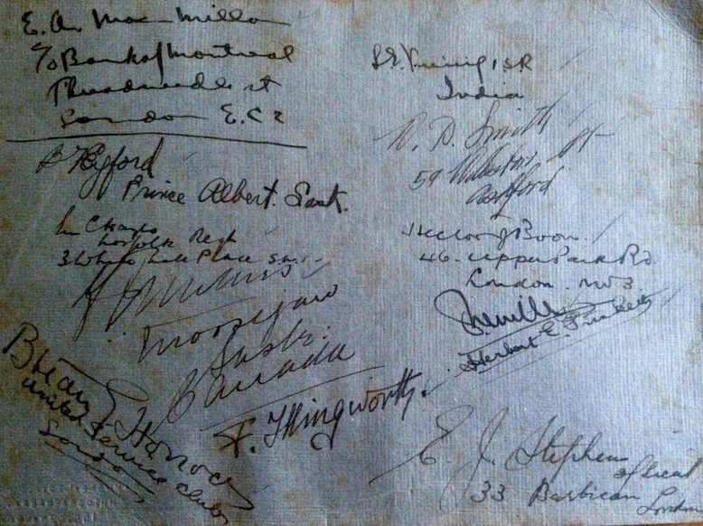After their ordeal in Russia, the last British Army prisoners-of-war to return from World War I held a reunion dinner at the Café Royal in Piccadilly. Unfortunately, not every member of the group had remained in London, but those that did attend, signed the back of a photograph that had been taken on board HMS Delhi.