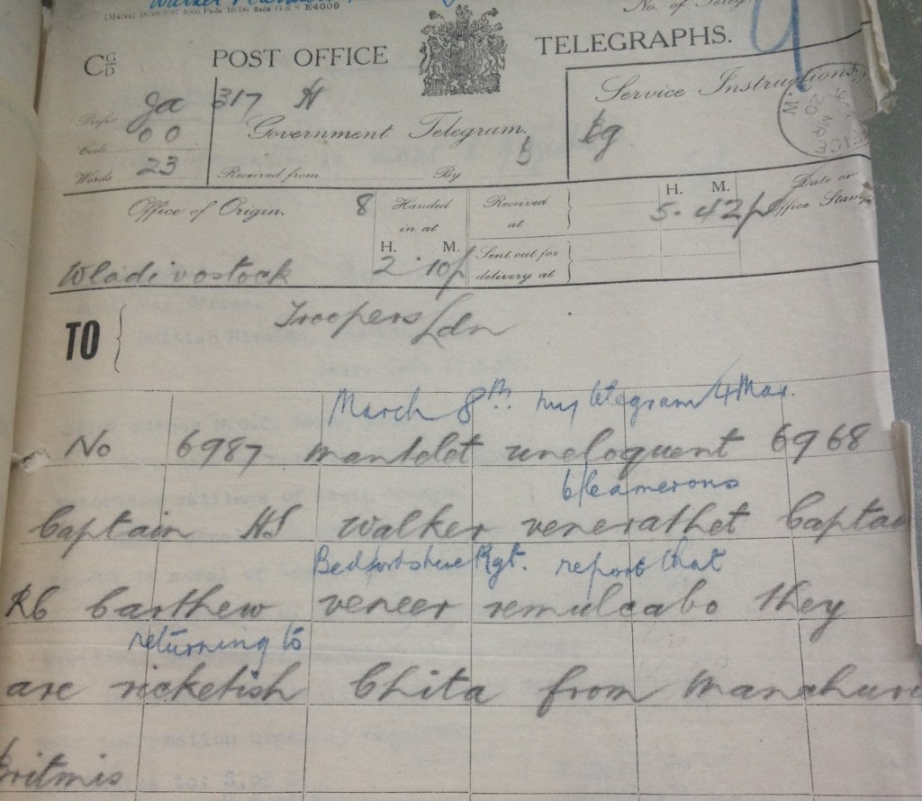 The MI imperative can be seen from the instructions to the Senior British Military Commander, Major General Sir Alfred Knox, which are shown in the document below. This reveals that the first group of British officers to travel to Siberia included three Russians: Henry Kartchkal Peacock had lived in Siberia for eight years and was well-versed in its culture (he was awarded an MBE in the Siberian Honours); William Gerhadi (awarded an OBE for his work as Knox’s aide), was later described by Evelyn Waugh in the highest terms: “I have talent, but you have genius”. The third member of this group, Captain Leo Steveni (awarded an OBE in the Siberian Honours), arrived in May and was already working with the White Russians when this document wes sent. Steveni’s unpublished memoir in the King’s College London Liddell Hart Collection was a vital source for my book.